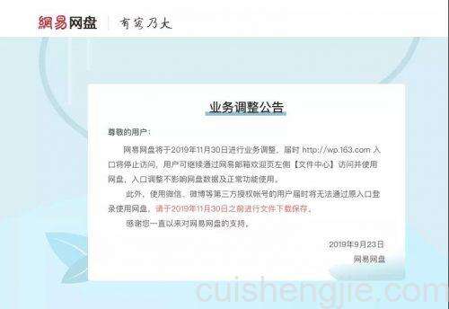 近日,网易官方发布产品调整计划,网易网盘将于2019年11月30日关闭wp.163.com入口,届时将无法访问。不过在这个时间到来之前,网盘用户依旧可以通过邮箱首页左侧的“文件中心”,继续访问并使用网盘。而第三方账号用户已经无法登录,官方还提醒用户在30日之前务必下载保存自己的文件。