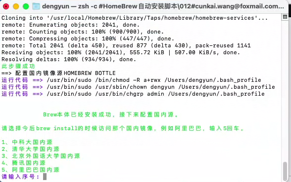 安装完毕后,他会提示你设置镜像源,以后你使用homebrew的话,默认就是从该镜像源进行搜索、下载和安装。